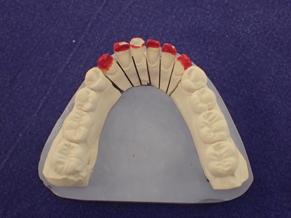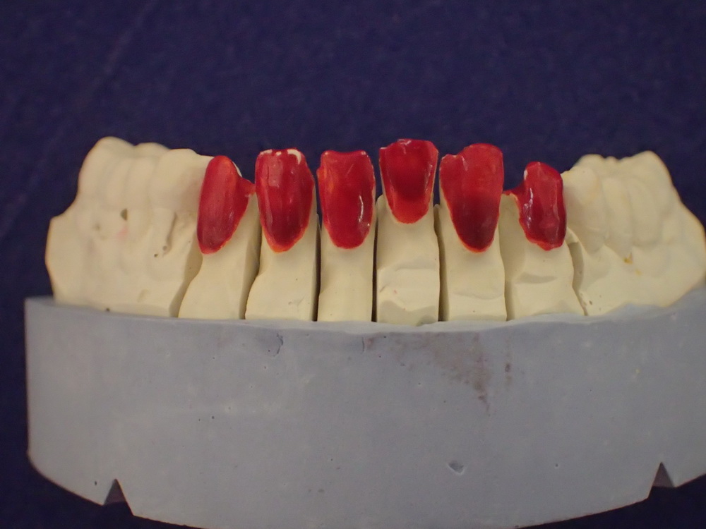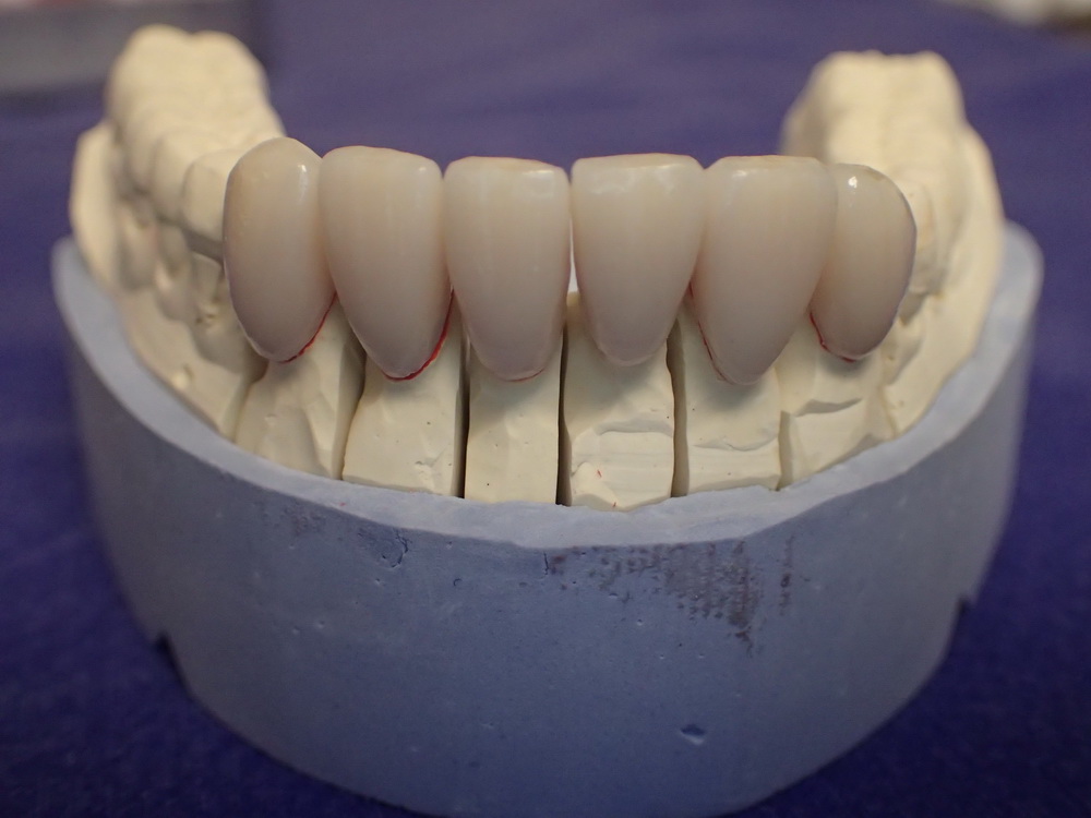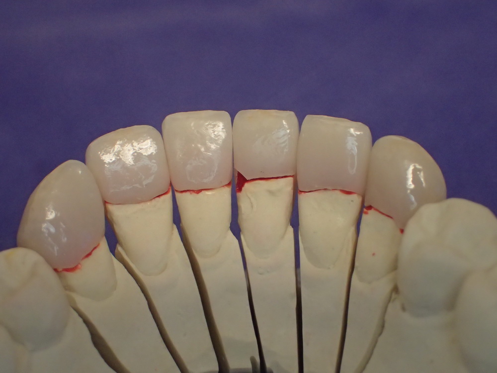 Die Teilkronen wirken dunkler, weil die Keramik transluzent ist und die rote Stumpflackfarbe durchschimmert.
