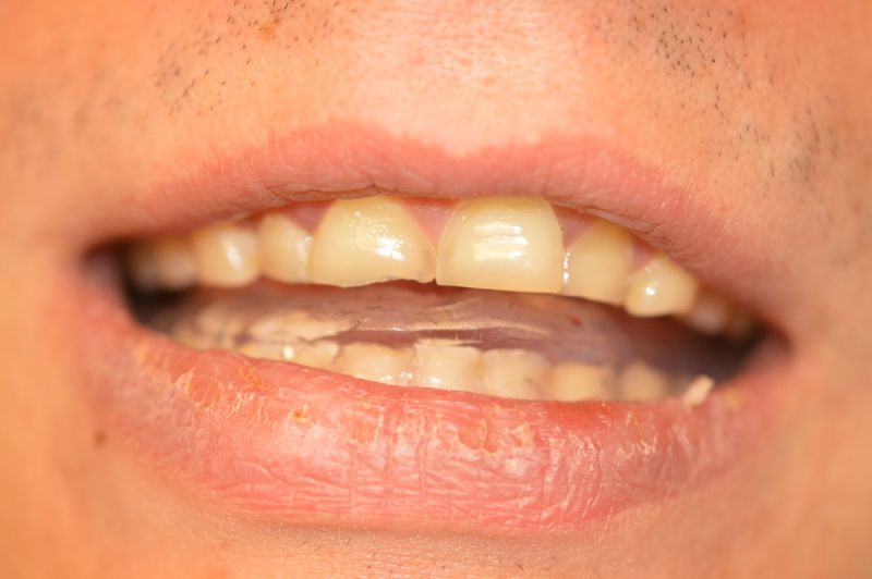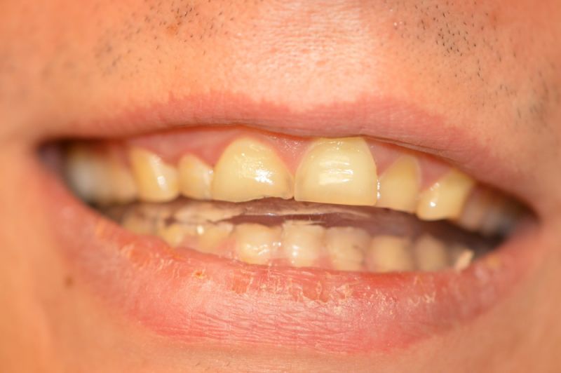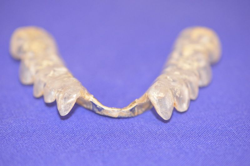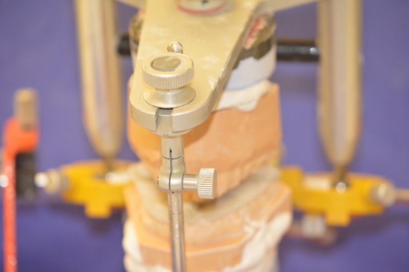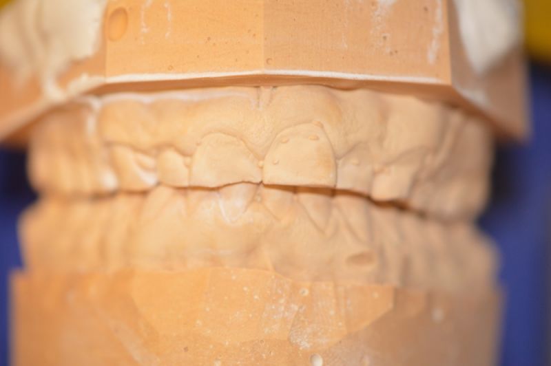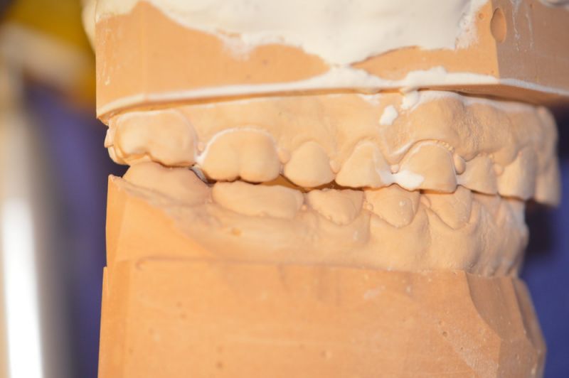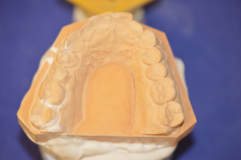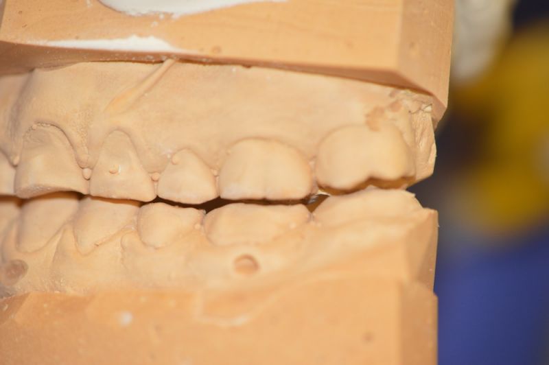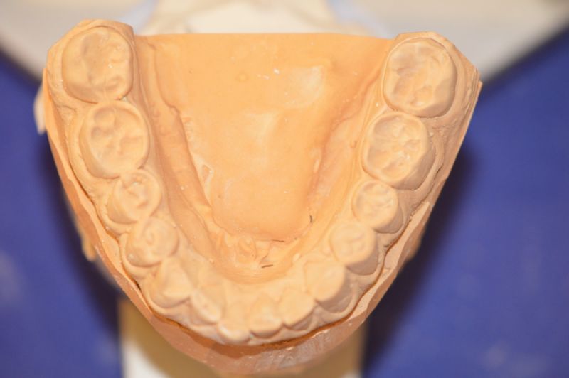 Die Herstellung eines neuen Aufbissbehelfs ist extrem erschwert durch die äußerst kurzen klinischen Restzahnkronen und damit die Möglichleit den Aufbissbehelf retentiv an den Zähnen zu befestigen.