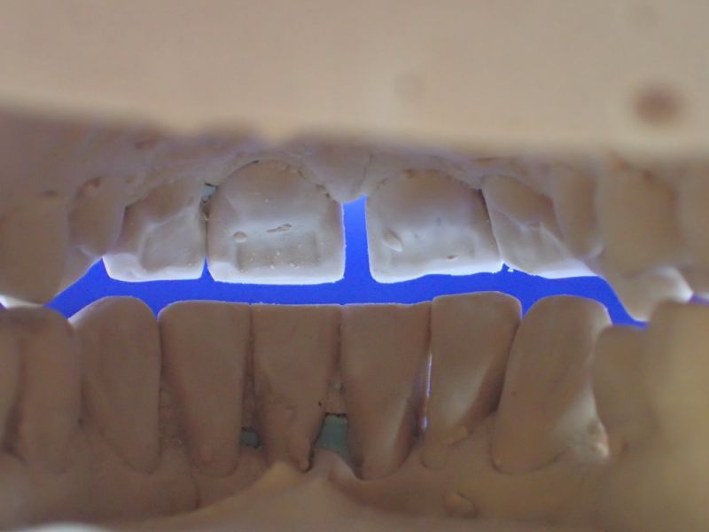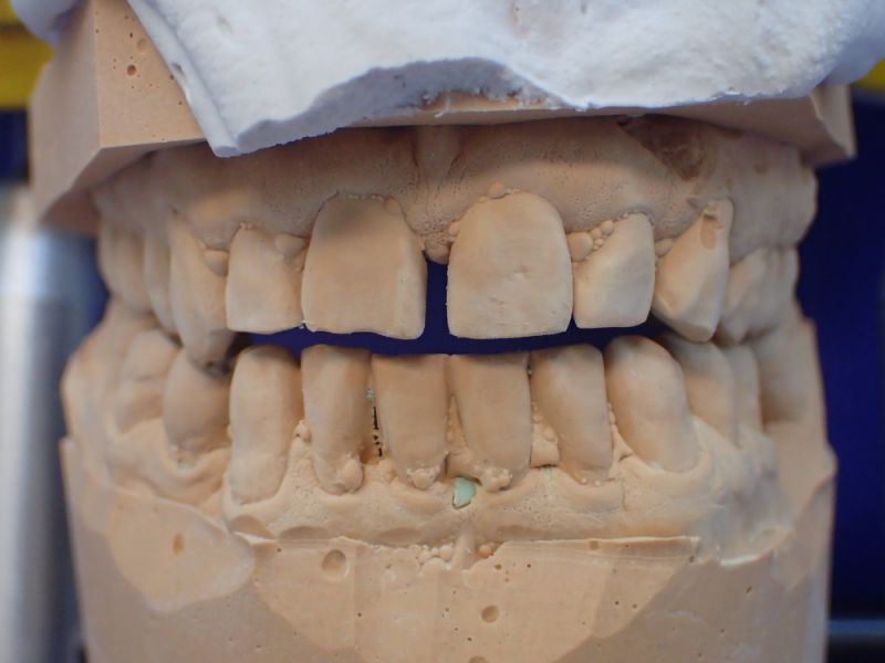Der behandlerische Zustand des Patienten stellt sich derart dar, dass er insgesamt 7 Schienen erhalten hatte und der aktuelle Behandler mehrere Zähne mit vollkeramischen Teilkronen versorgt hat.