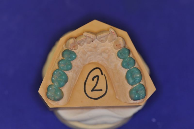Nachdem es bei dem Patienten mit der adhäsiven Befestigung der Laborgefertigten Dauerprovisorien in diesem Fall doch erheblche Probleme gegeben hat, wurde inzwischen auf einen friktiven Befestigungsmechanismus umgestellt.