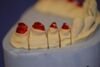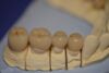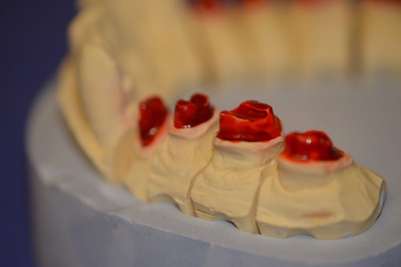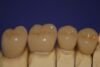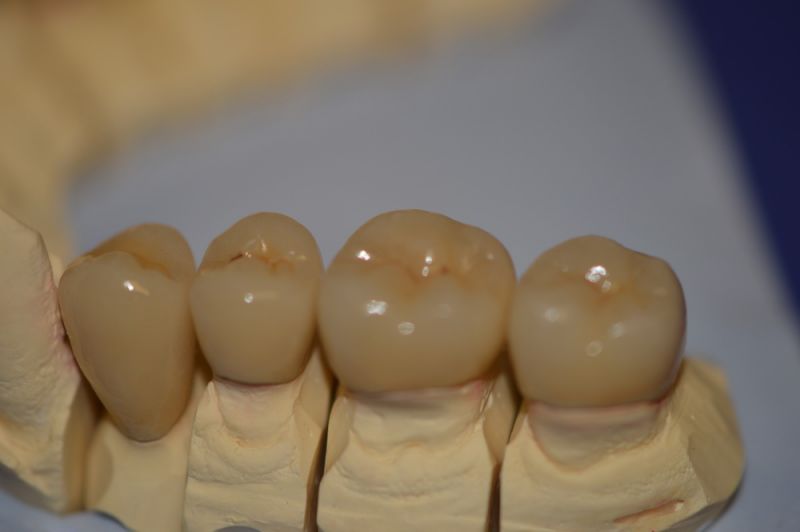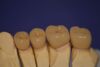 Angesichts des Alters des Patienten wurde dazu vorrangig der Punkt der Zahnerhaltung in den Vorgedergrund gestellt, so dass die Präparationsgrenzen der kermisch verblendeten Teilkronnen quer über den Zahn laufen.