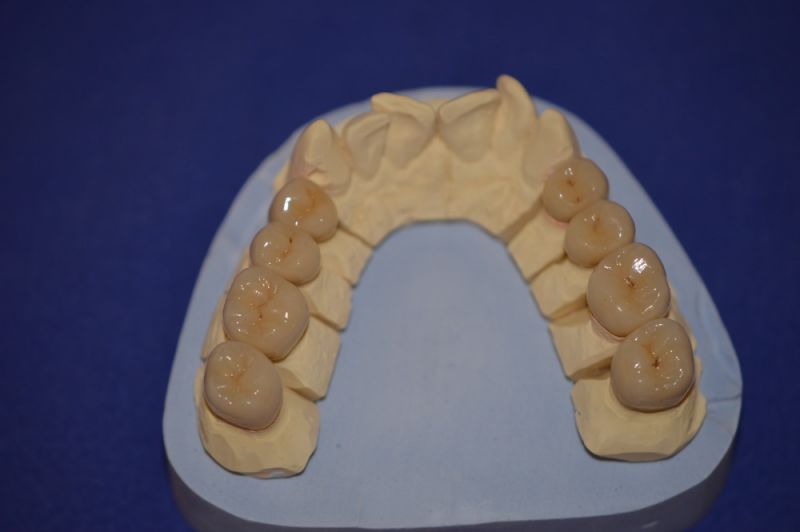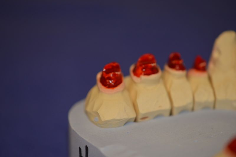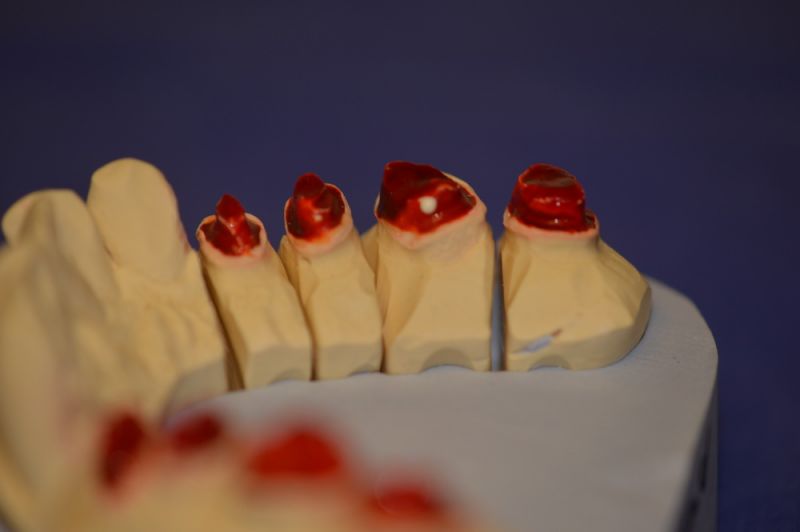Ursprünglich in Vollkeramik geplant, musste dieses Behandlugskonzept aufgegeben werden, weil sich zeigte, dass die Restzahnsubstand des Patienten derart mineralisiert war, dasse s trotz widerholter Versuche nicht gelang ein Ätzretentionsmuster anzulegen, mit dem eine adhäsive Zementierung gelang.
