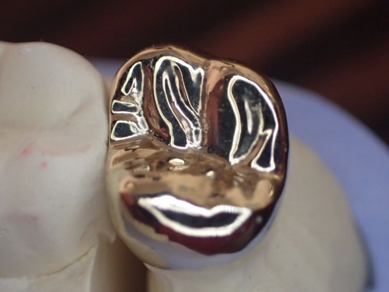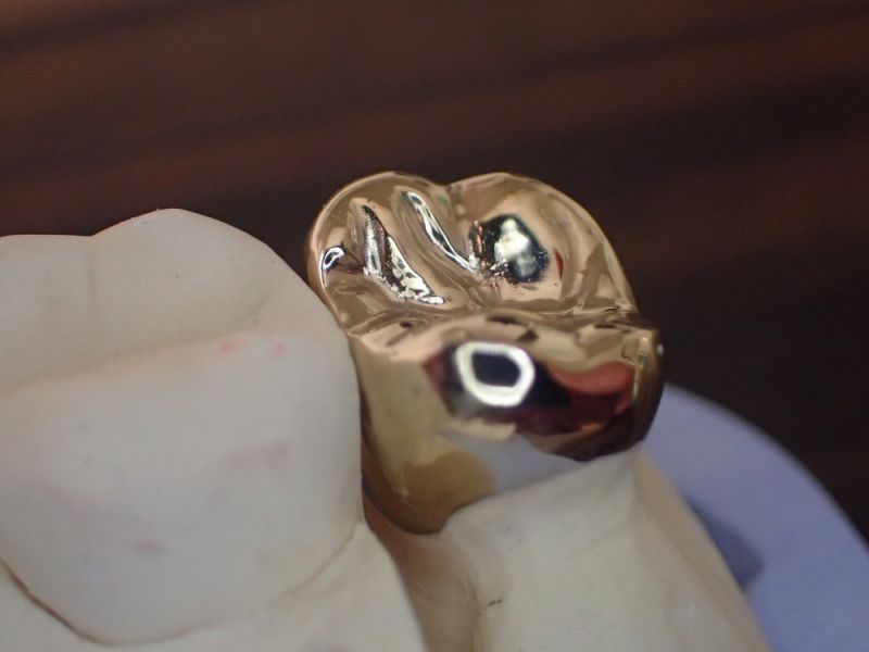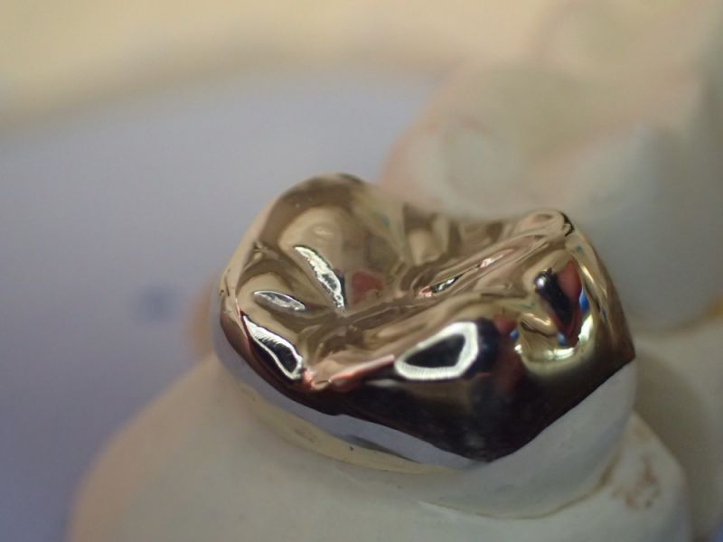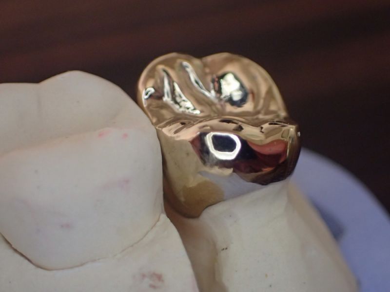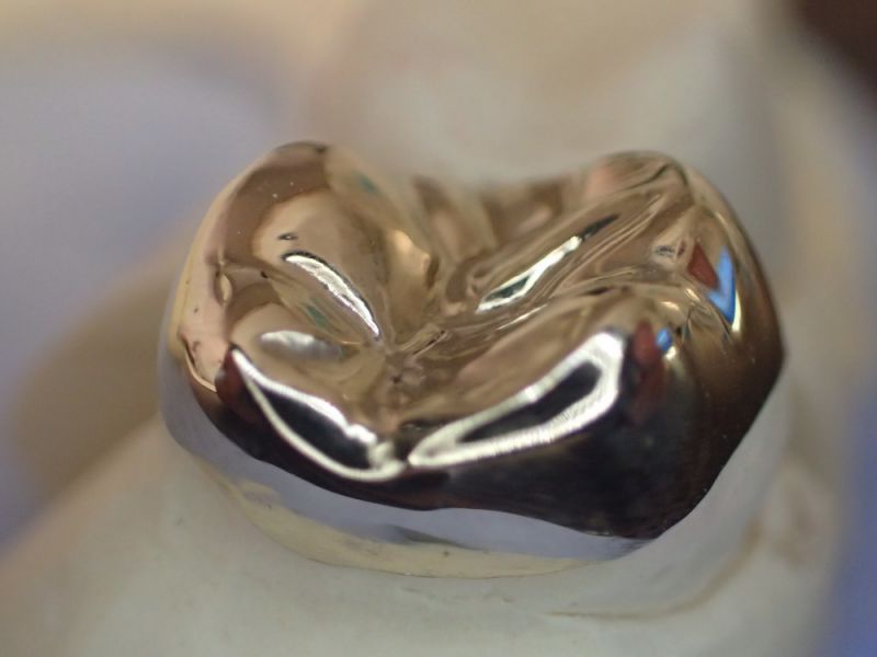 Früher, zumindest in dieser Praxis Standard, heute absolute Ausnahmeerscheinung: Hochgoldhaltige Edelmetallkronen. Kaum noch zu bezahlen, materialtechnisch immer noch das Beste, was es gibt.