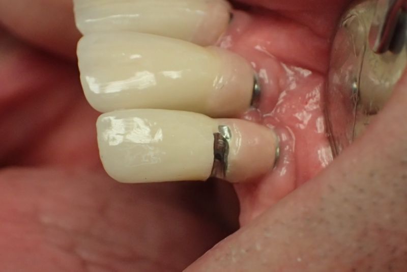 Aus vorhandenen Dokumentationen liegen sogar noch die Fotos zum Zeitpunkt der Versorgung des Implantates 22 vor, auf denen man zu erkennen vermag, wie unwahrscheinlich lang der Komplex aus Implahtataufbau und klinischer Krone in diesem Behandlungsfall ausfiel.