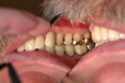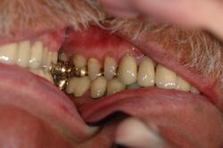 Man kann an dem weißlich, straff gestippelten Zahnfleisch im Bereich der Unterkieferseitenzähne erkennen, dass hier keinerlei Entzündung vorhanden ist. Dieser Zustand ist bei Kronenversorgungen nur dann gegeben, wenn die Kronen einwandfrei sitzen.