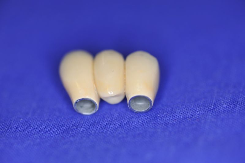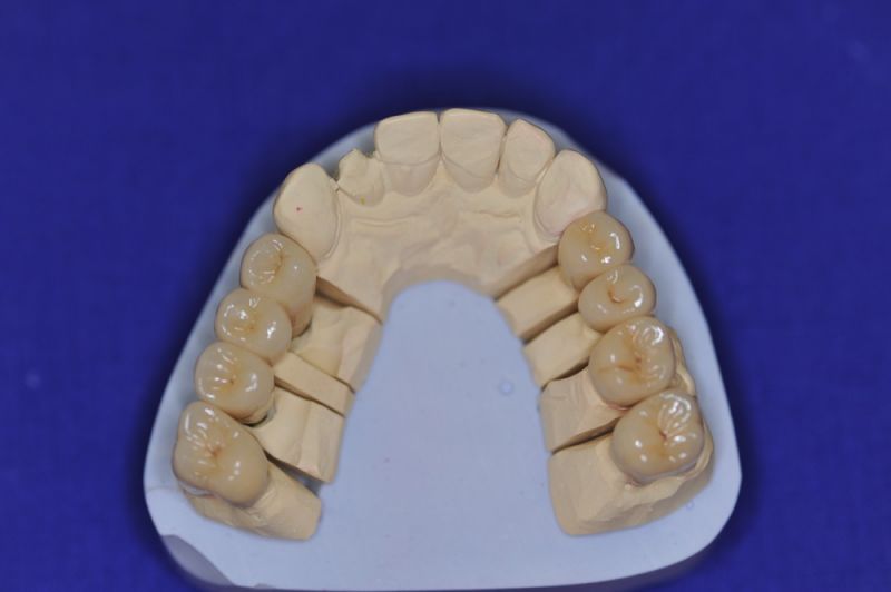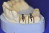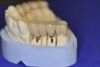 Man beachte die bewusst angelegten metallischen Ränder an den vollverblendetn Teilkronen zur besseren Curettage im Rahmen der durchzuführenden parodontalen Recallsitzungen.