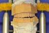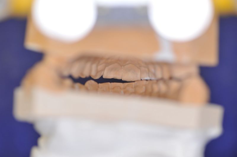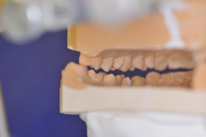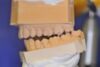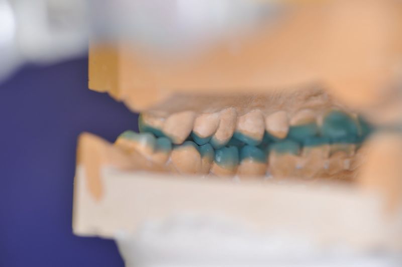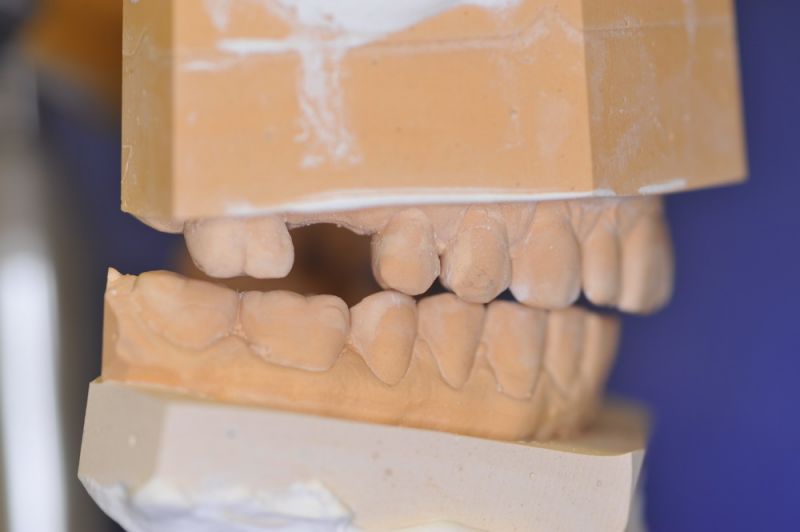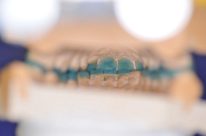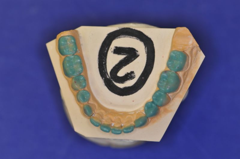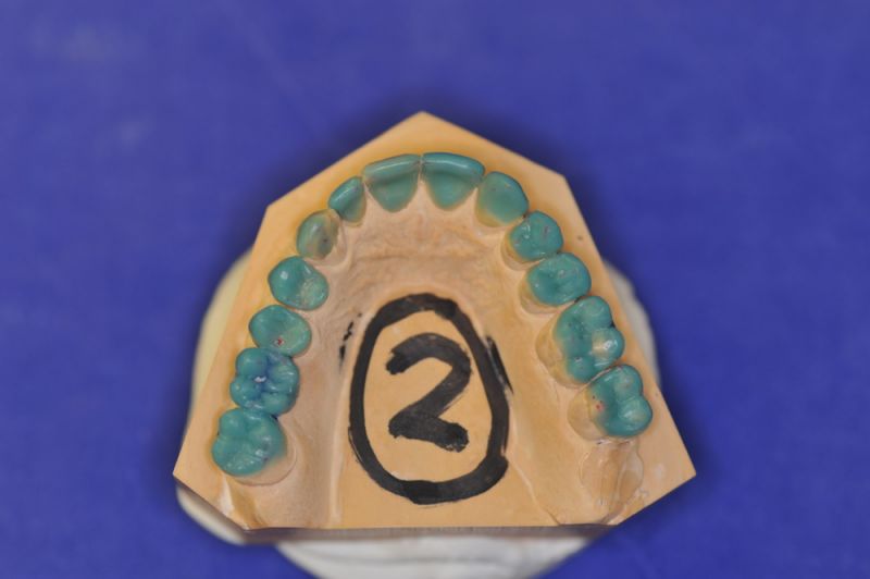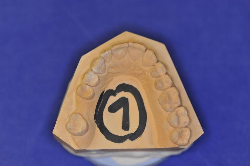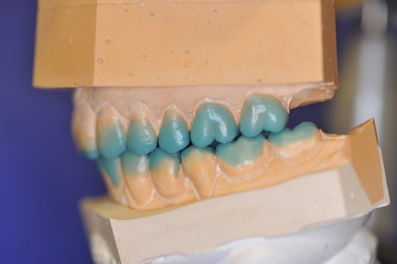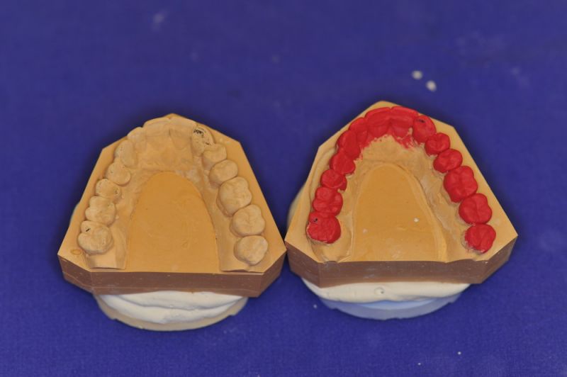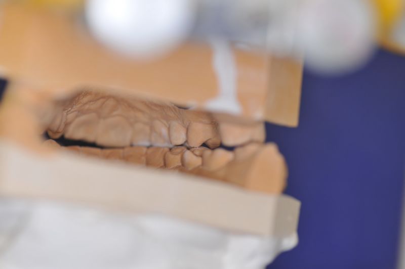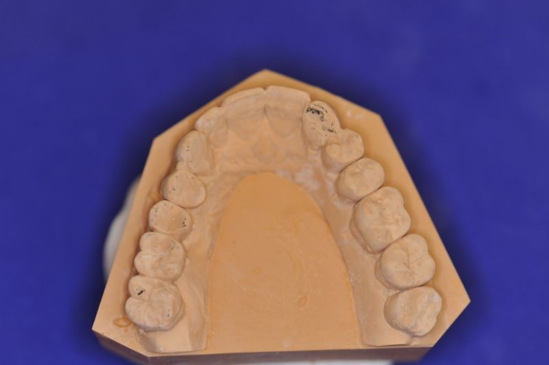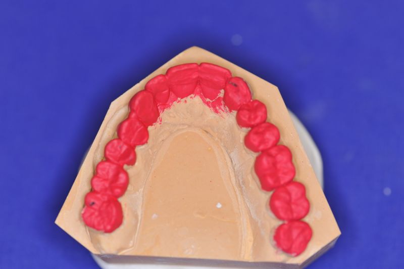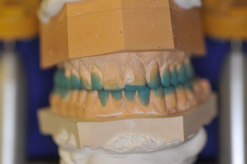Da die patientin auch nach diesen aufwändigen Behandlungen starke funktionelle Probleme hatte, wurde nach Vorbehandlung und Verbesserung ihrer Beschwerden mit einem adjustierten Aufbissbehelf ein "Diagnostisches wax up " erstellt, um zu prüfen, ob es möglich ist in die dysgnathe Bisslage eine weitgehende "Normalfunktion" zu integrieren.