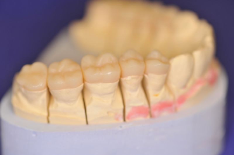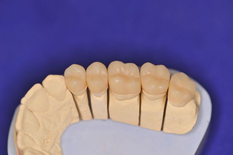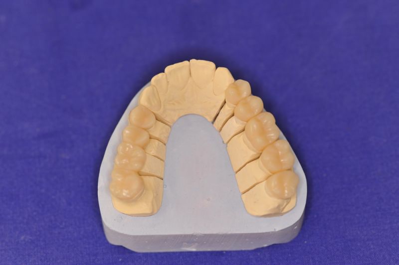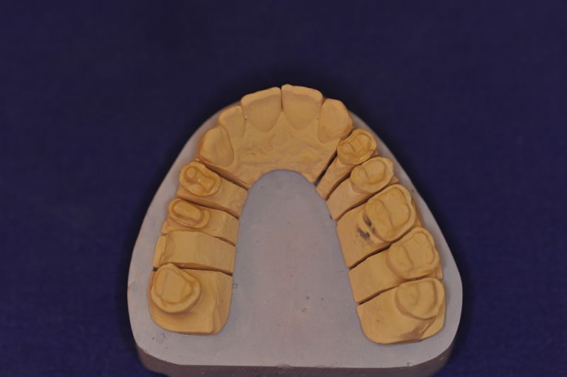 Es wurden die ersten Laborgefertigten Dauerprovisorien adhäsiv zementiert. Bis zum nächsten Montag, an dem die Laborgefertigten Dauerprovisorien für den Unterkieferseitenzahnbereich präpariert und abgeformt werden, wurde der noch vorhandene Aufbissbehelf umfangreich im Labor umgearbeitet, weil die Bissverhältnisse zur Zeit nicht stimmen und erst mit jedem weiteren Behandlungsschritt die angestrebte neuromuskulär zentrierte Bisslage erreicht wird. Insofern kann zur Zeit noch mit einem adjustierten Aufbissbehelf korrigierend eingegriffen werden.